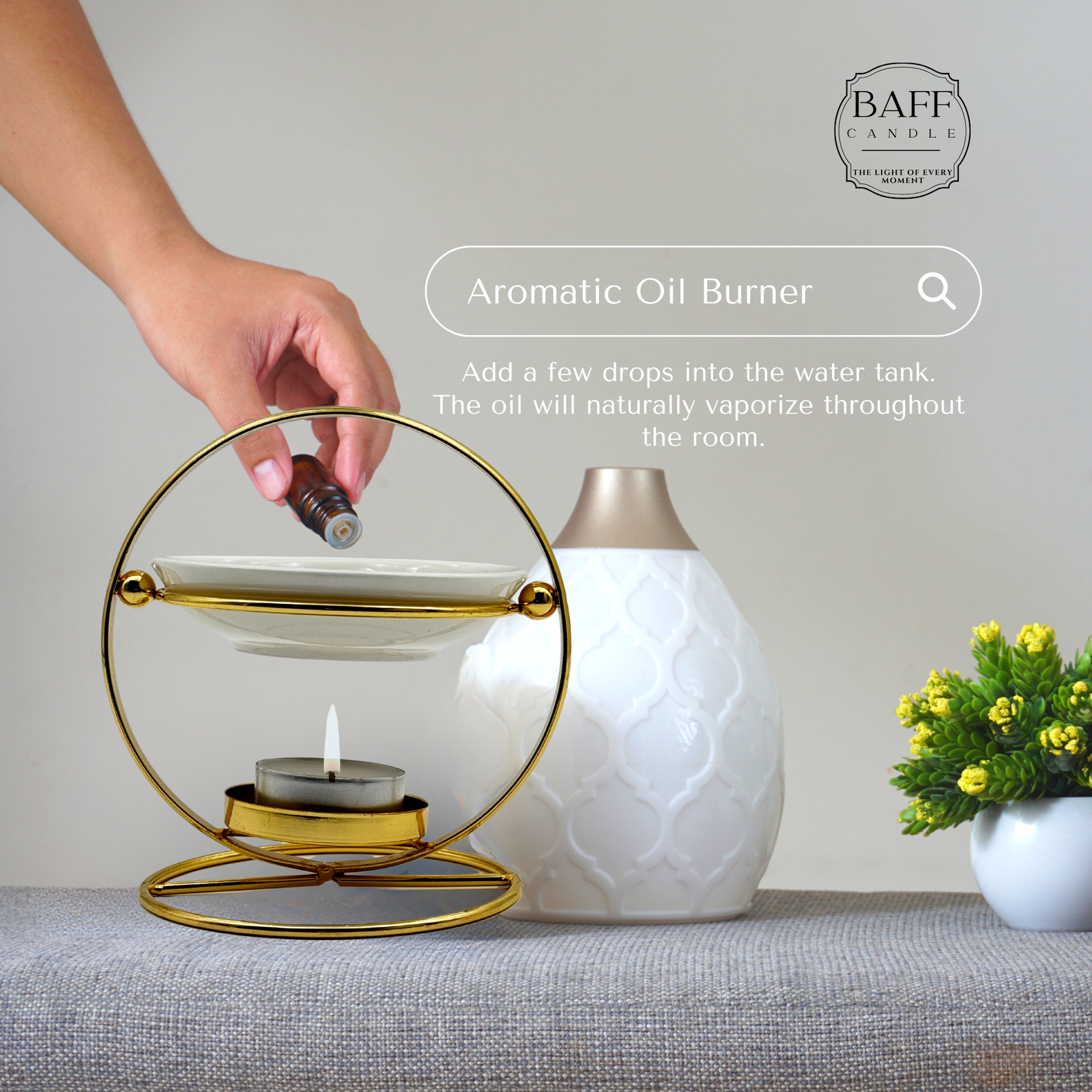 - Aroma Burner: Add water and 5–10 drops to the bowl of your aroma burner.
