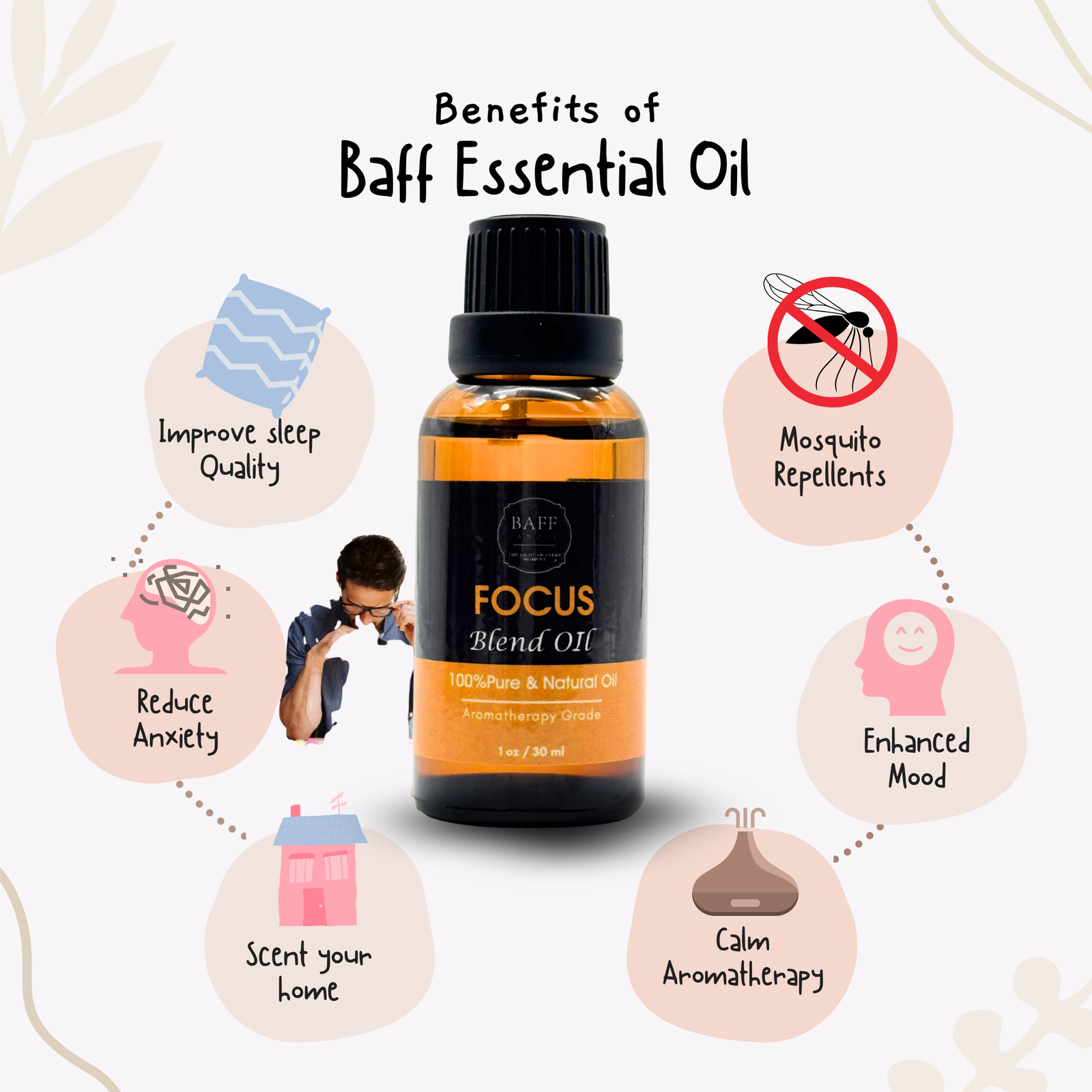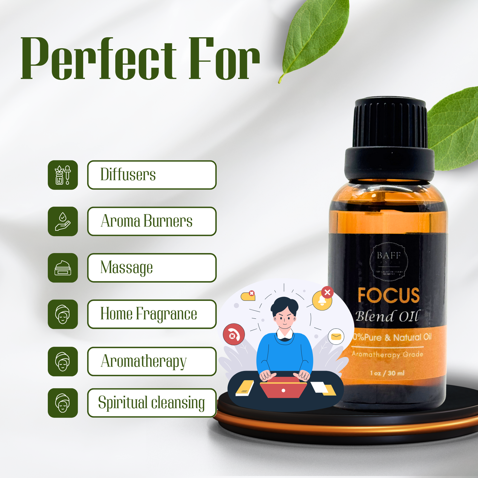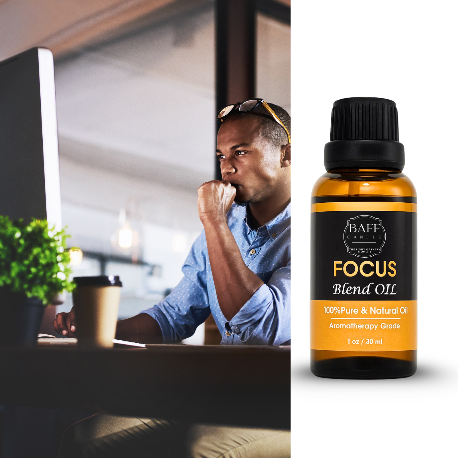 Designed to sharpen the mind and uplift the senses, Baff Focus Essential Oil is a thoughtfully blended synergy of pure botanicals known for enhancing concentration, alertness, and mental clarity. Ideal for use during work, study, or creative sessions, this 100% pure aromatherapy-grade blend supports sustained attention and a calm, focused mindset. Whether diffused into your workspace or massaged onto pulse points, it helps you stay present, productive, and grounded.