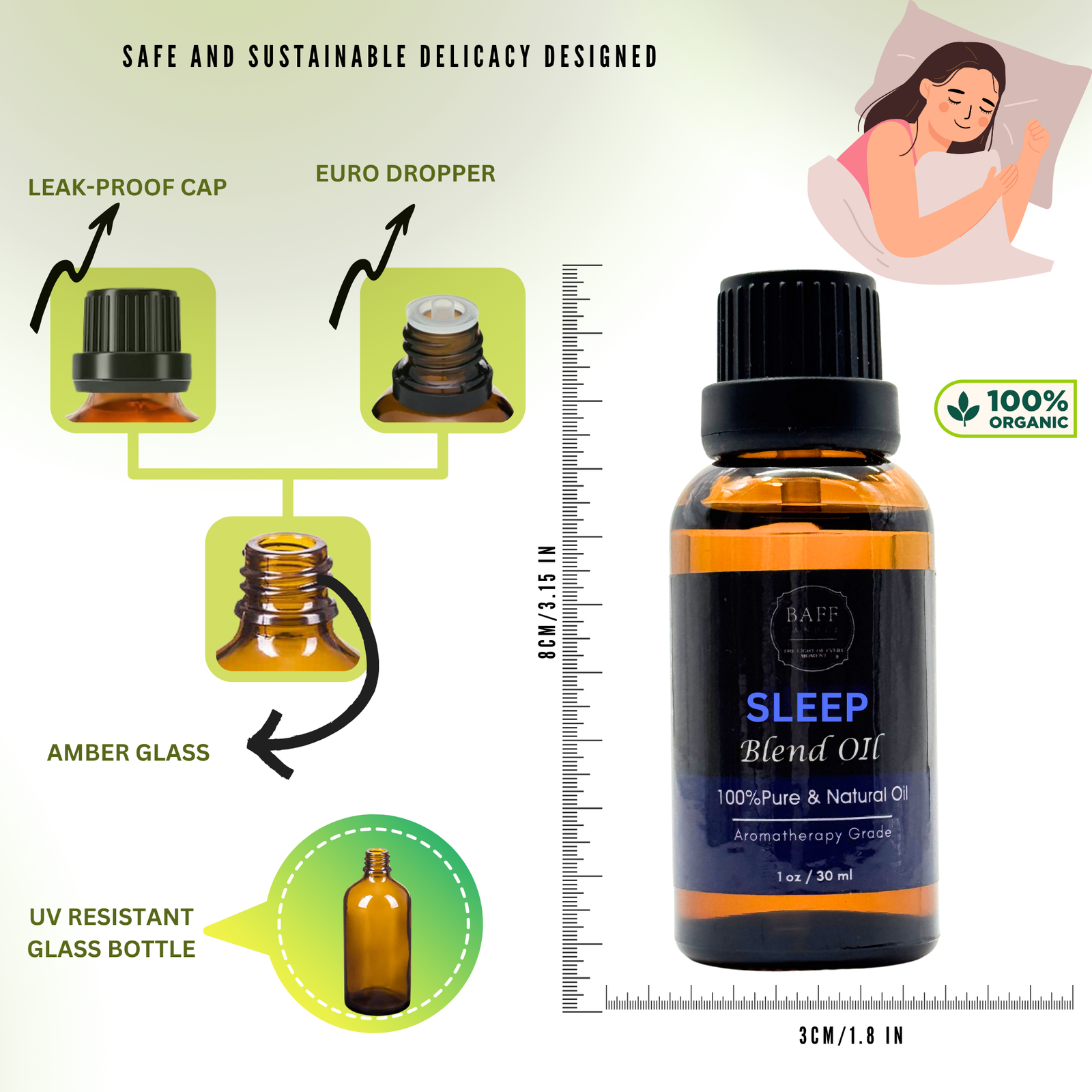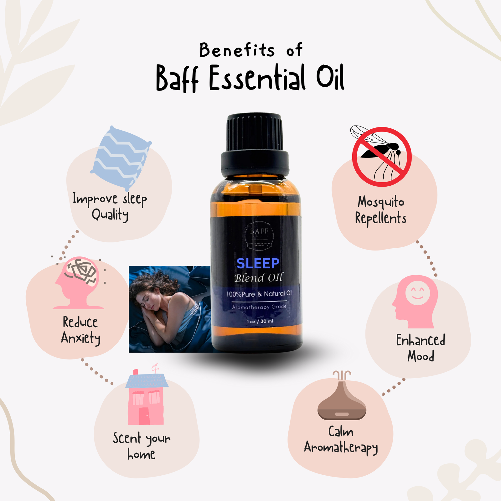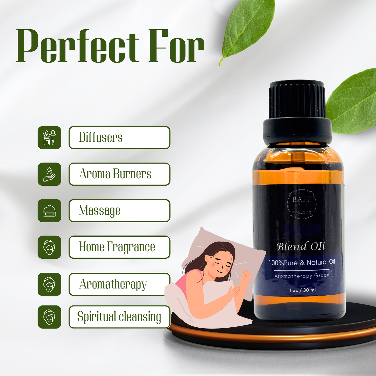 Crafted for deep rest and nighttime tranquility, the Baff Sleep Blend Essential Oil is a carefully balanced fusion of calming botanicals known for their sedative and soothing effects. Ideal for use in diffusers, burners, massage, or pillow sprays, this 100% pure aromatherapy-grade oil promotes natural relaxation and helps ease the mind into restful sleep. Whether you’re establishing a bedtime ritual or seeking relief from stress-induced restlessness, this blend supports true mental and physical unwind.