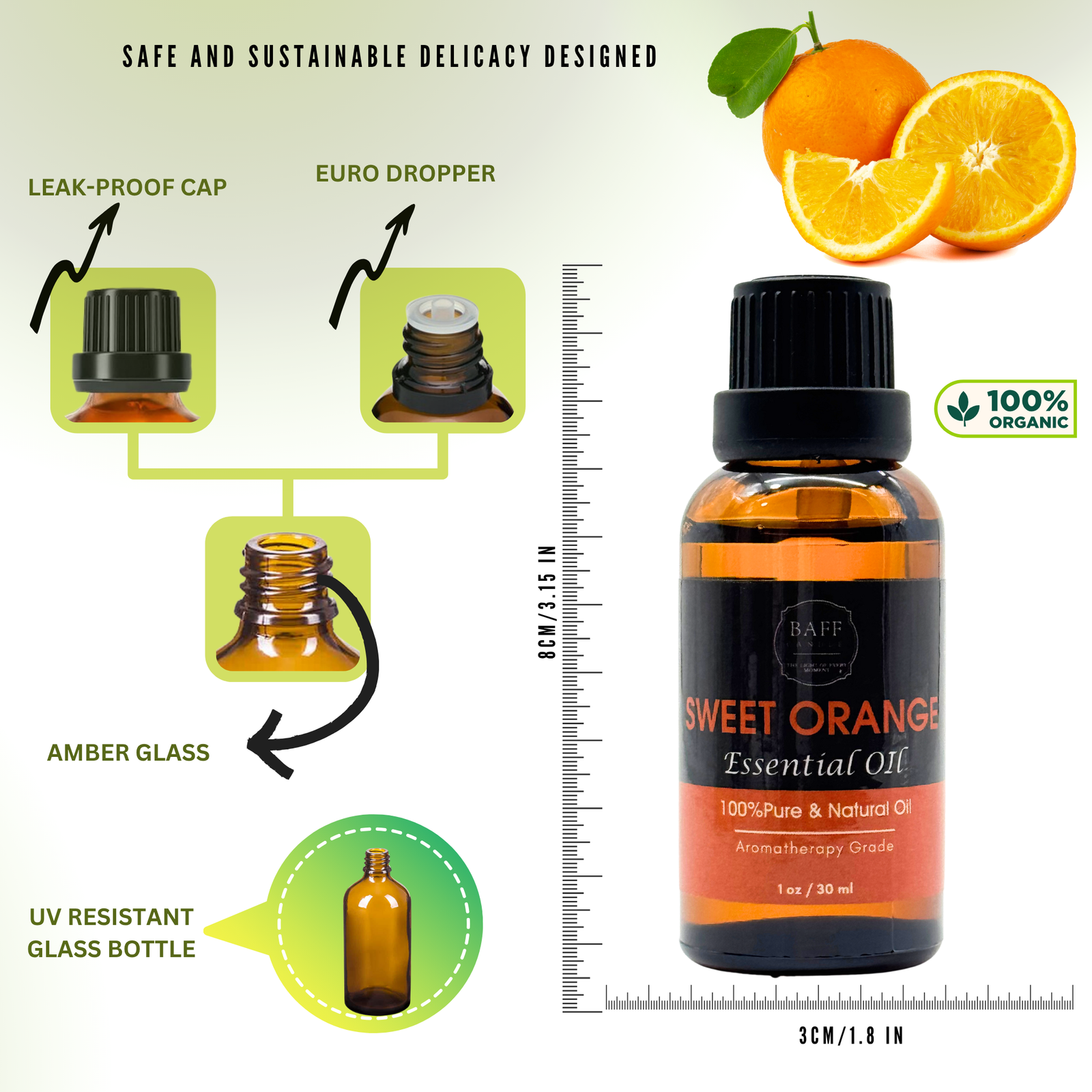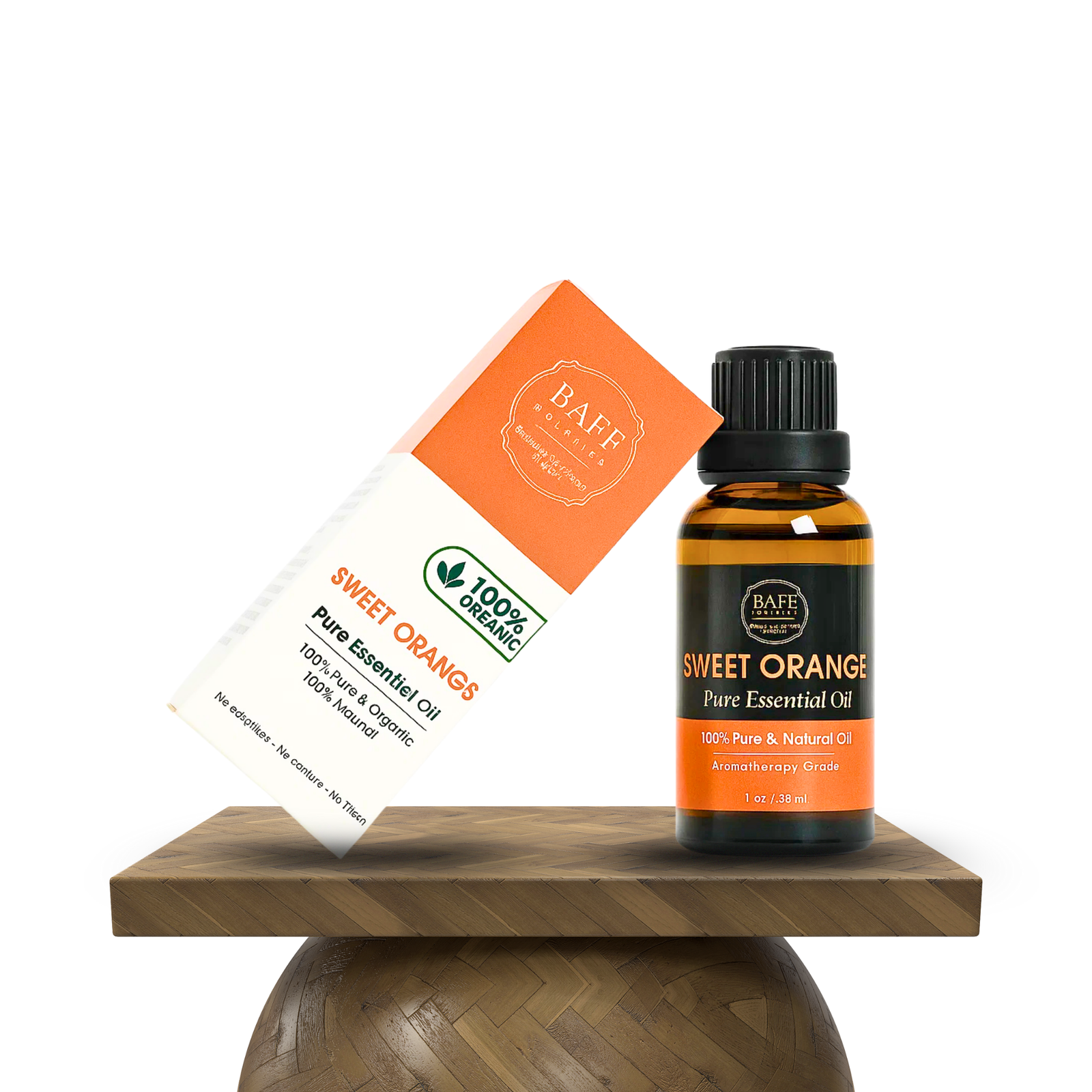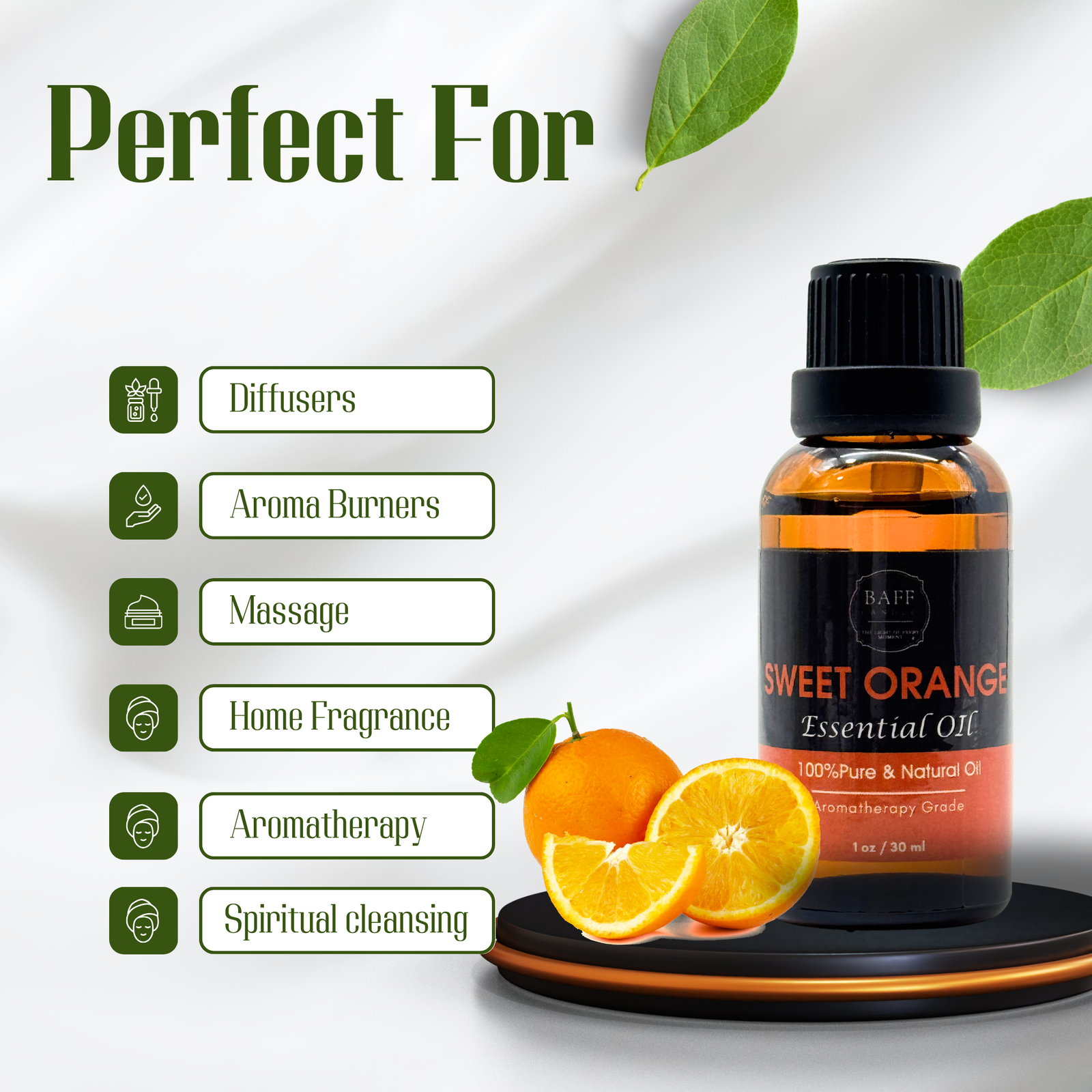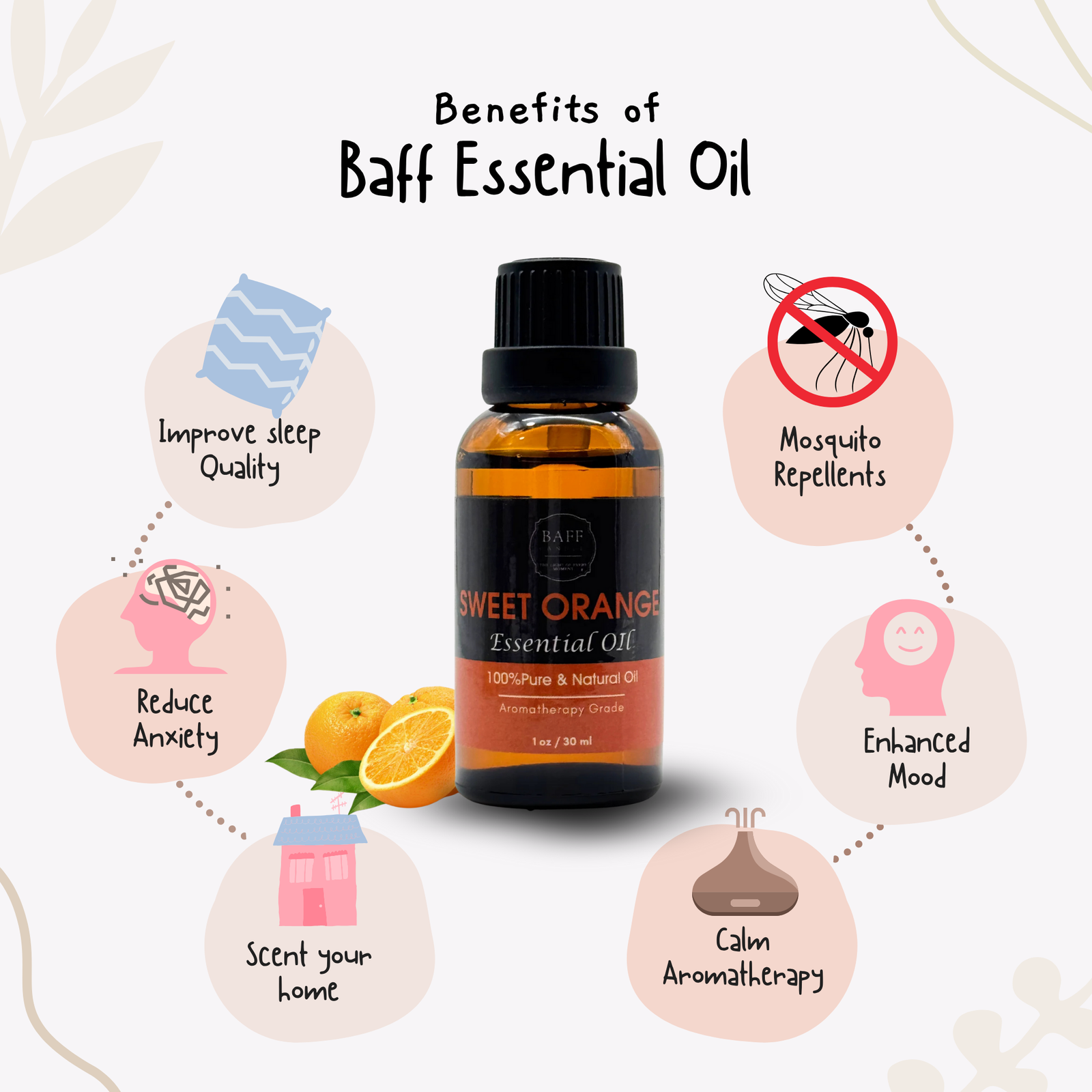 Baff Sweet Orange Essential Oil is a cheerful and refreshing extract cold-pressed from the rind of ripe oranges. With its vibrant, fruity aroma, this 100% pure essential oil instantly lifts the spirit and invigorates the senses. Sweet Orange is widely used in aromatherapy to reduce stress, refresh the mind, and bring emotional harmony. It also supports digestion and purifies the air, making it a versatile staple for your wellness and home care routines.