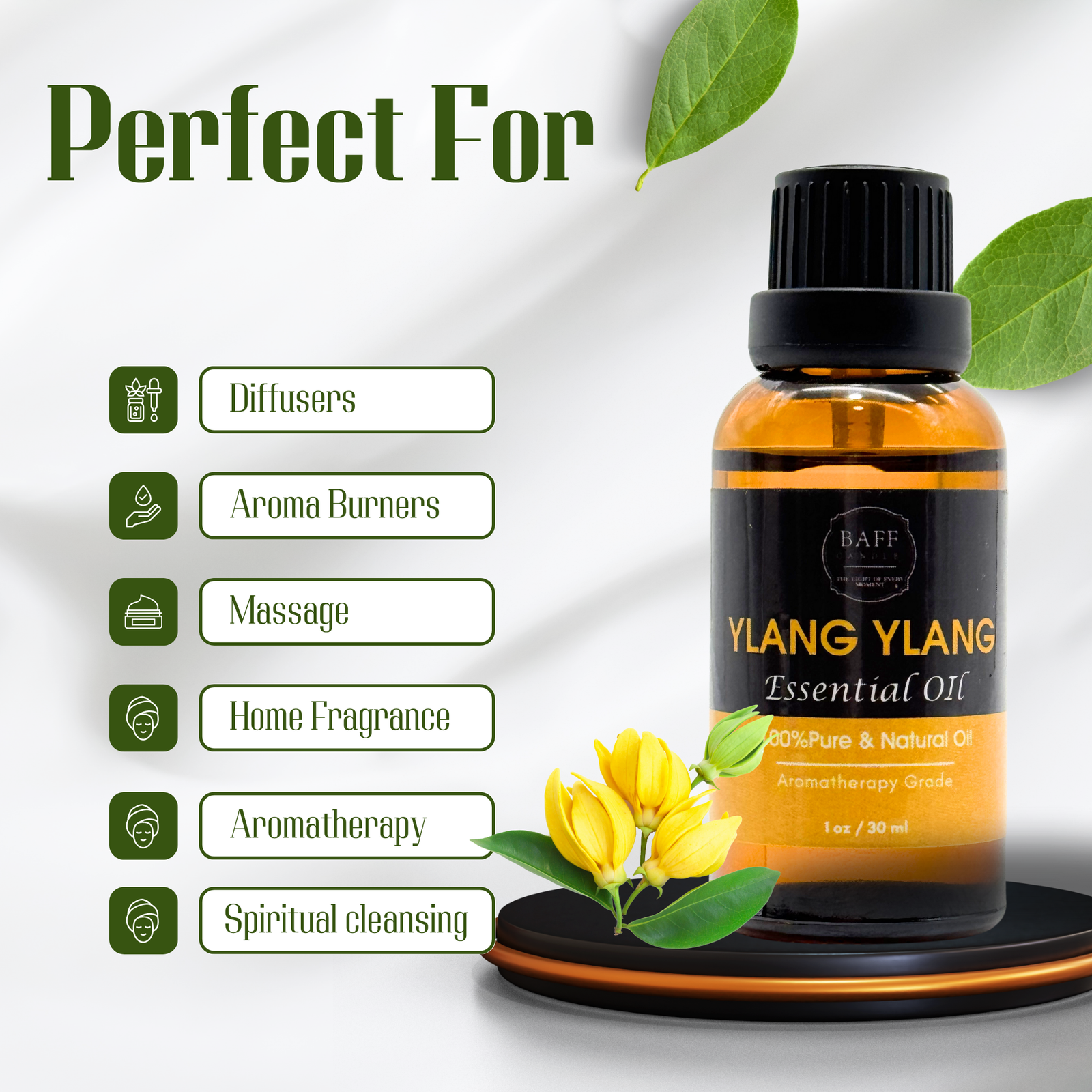 Baff Ylang Ylang Essential Oil is a luxurious, steam-distilled essence from the delicate flowers of the Cananga tree. Celebrated for its rich, sweet floral aroma, this 100% pure oil is renowned in aromatherapy for its calming, mood-lifting, and aphrodisiac properties. It helps reduce stress, balance emotions, and inspire joy and sensuality. Spiritually, Ylang Ylang is used to open the heart chakra and encourage self-love and deep connection.