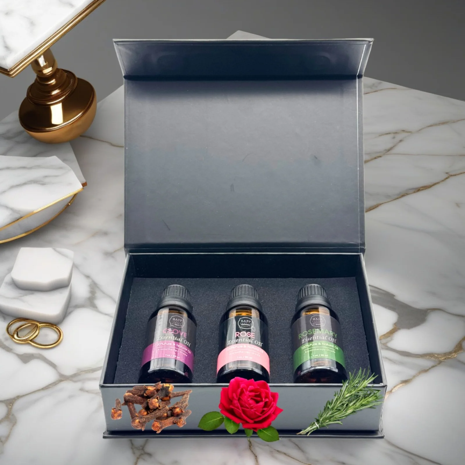 The Baff Essential Oil Collection combines the warming spice of Clove, the romantic elegance of Rose, and the refreshing clarity of Rosemary into one luxurious set. Each oil is sourced from the finest organic botanicals and extracted to preserve therapeutic potency. Whether you wish to create a cozy atmosphere, promote relaxation, or improve focus, this collection delivers a complete sensory experience for both mind and body.