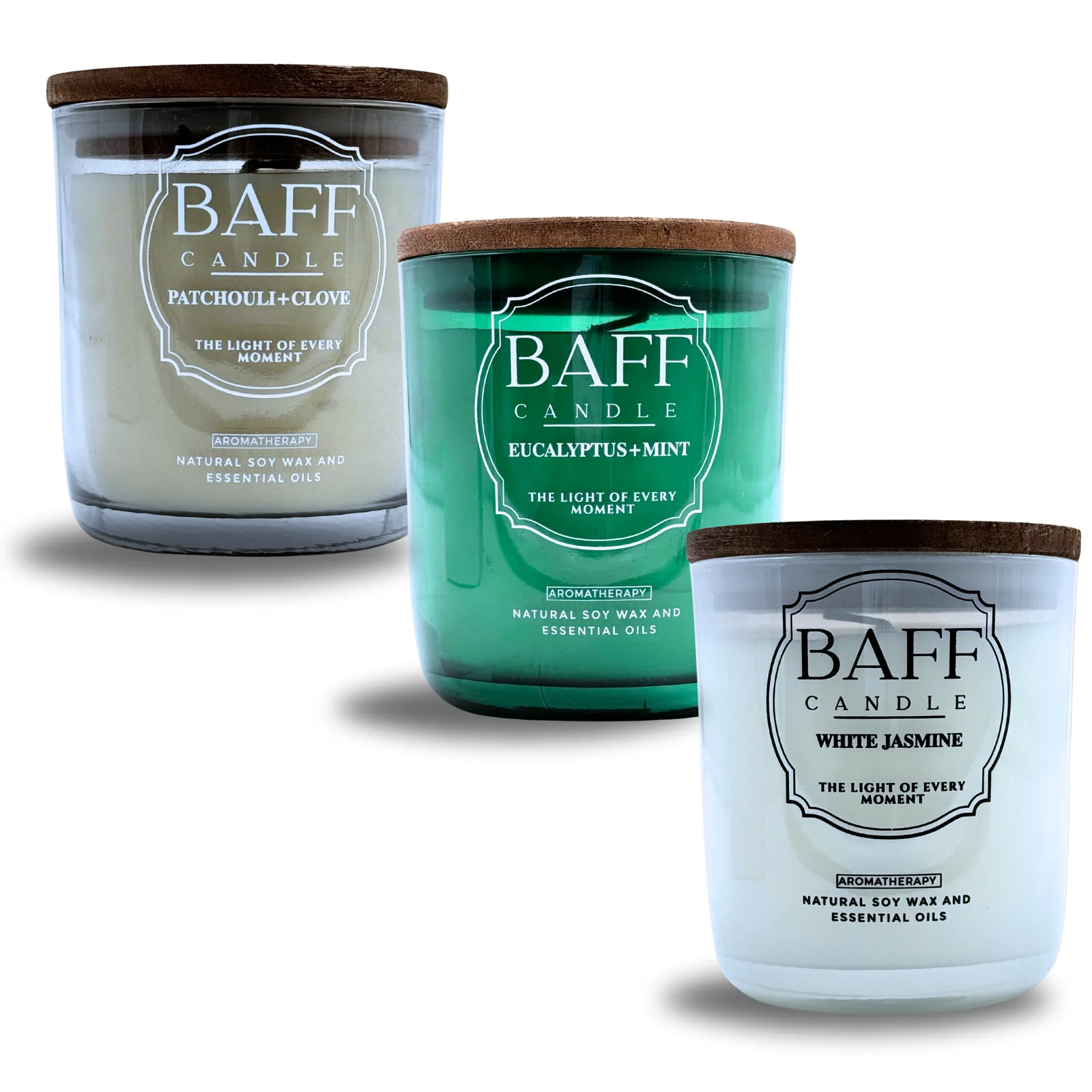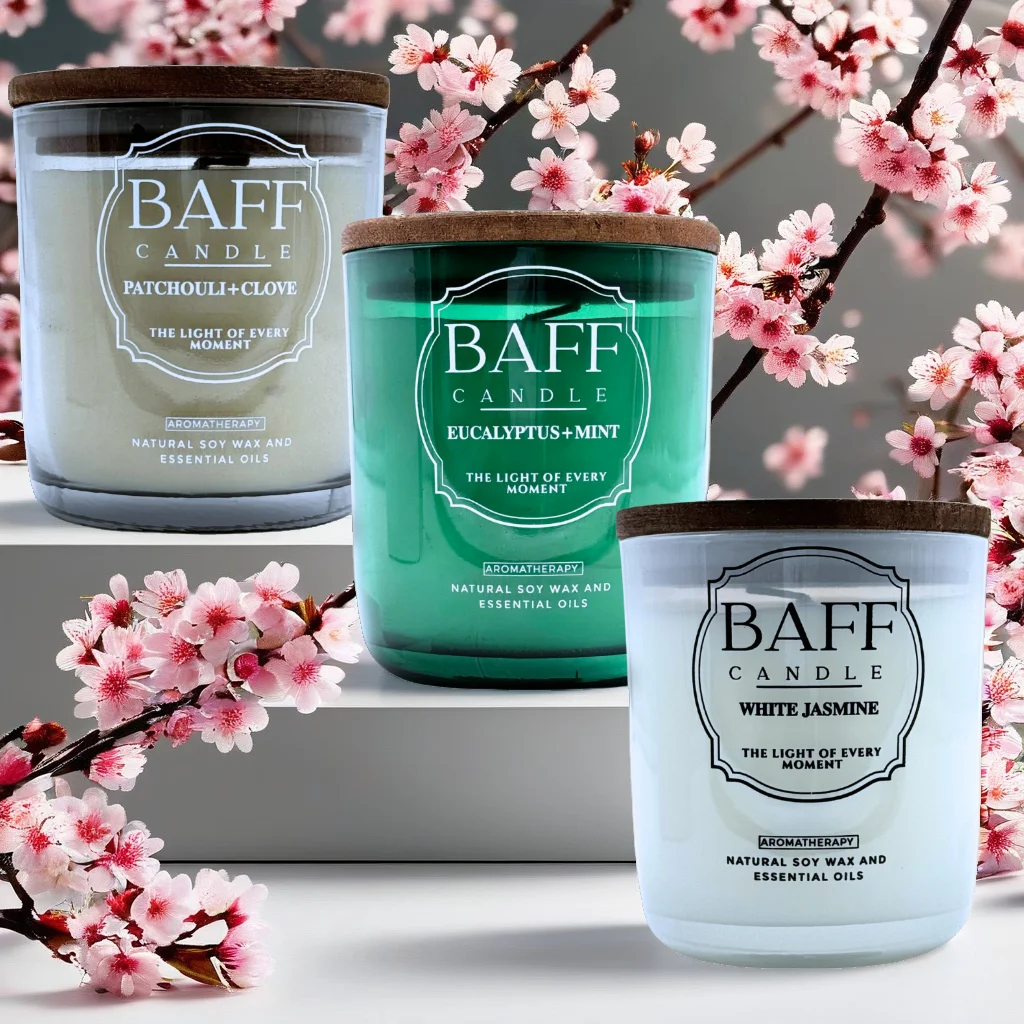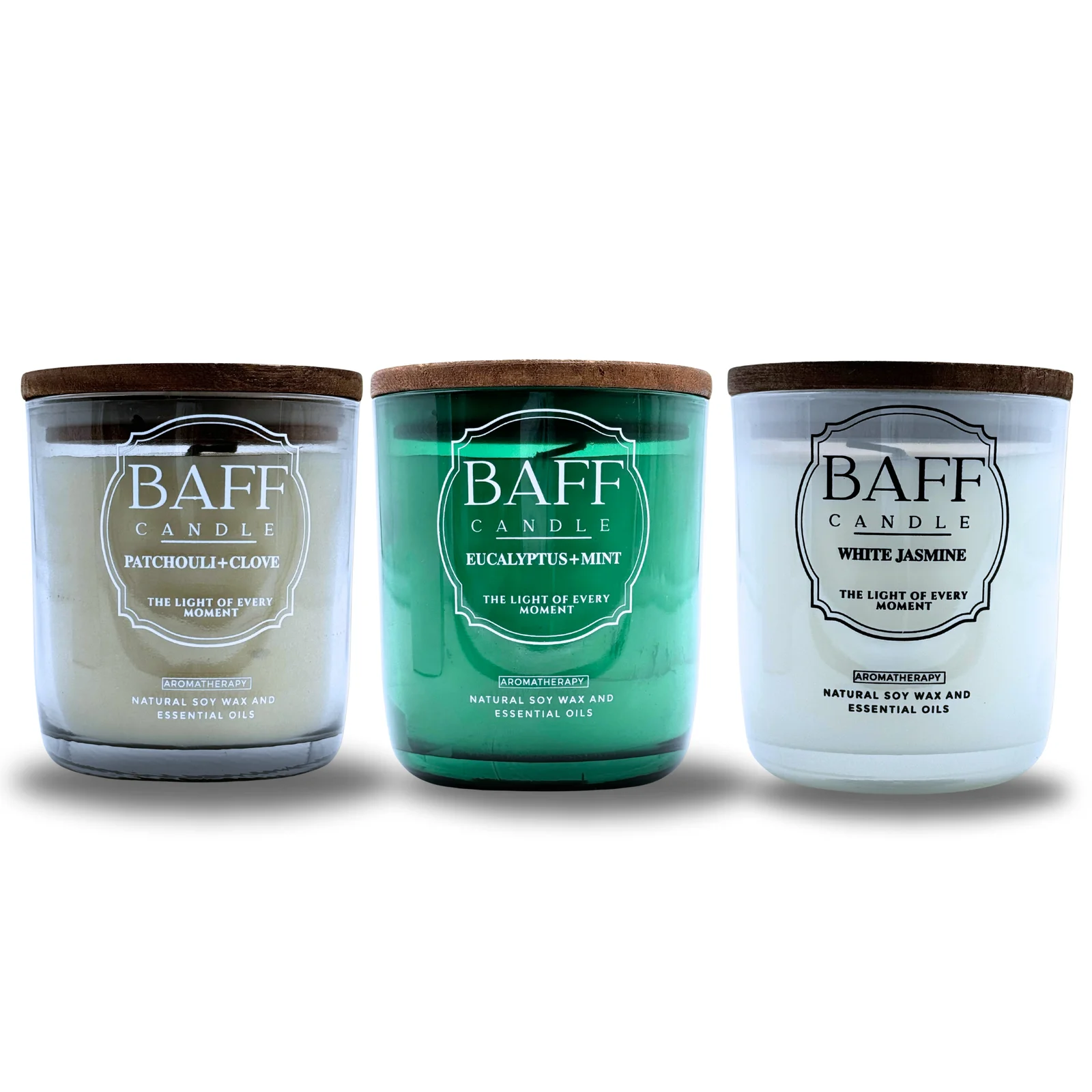 baff candle collection | patchouli clove | eucalyptus mint | whiteBaff Candle Collection | Patchouli Clove | Eucalyptus Mint | White Jasmine