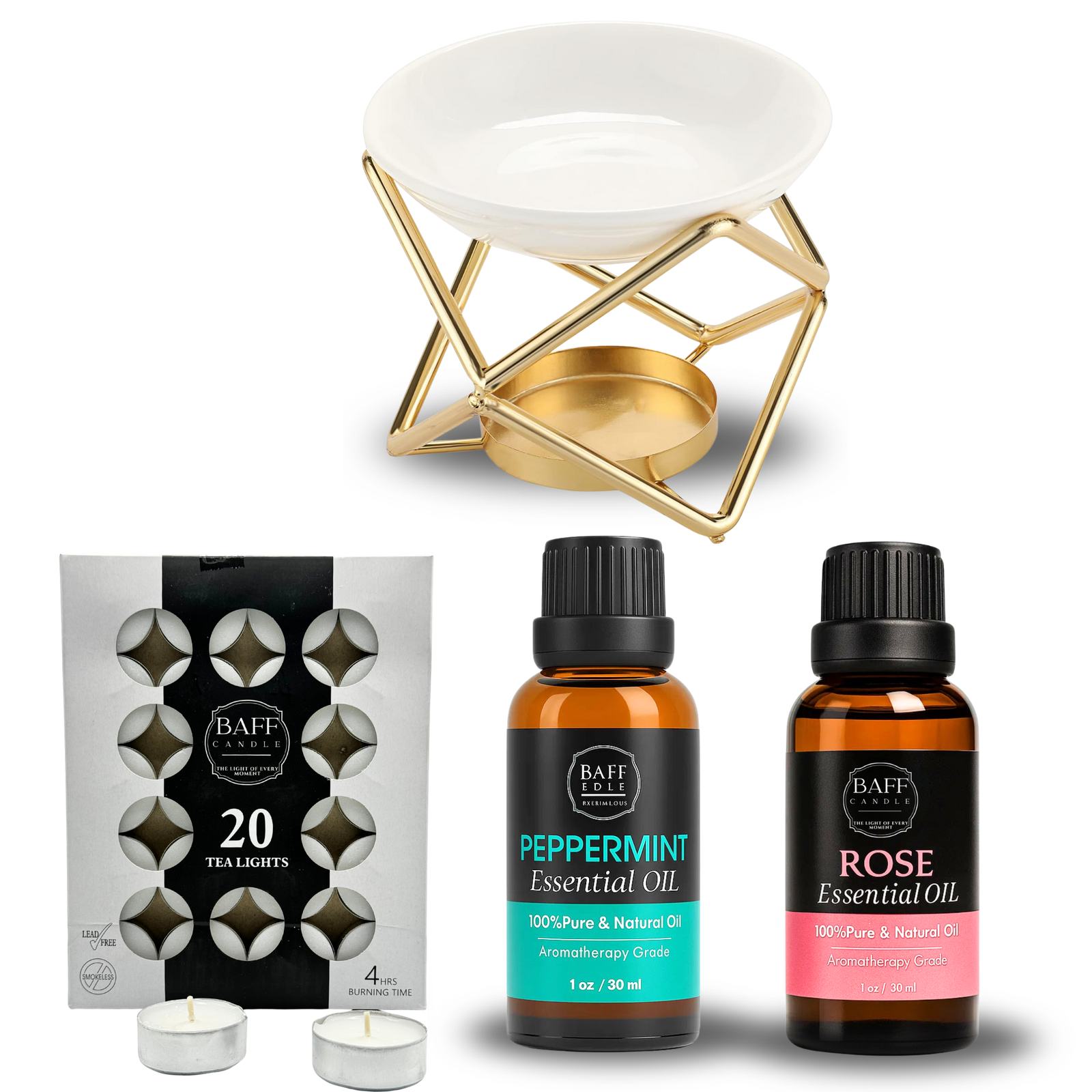 Includes Peppermint & Rose Oils, ceramic Aroma Burner, and Tea Light