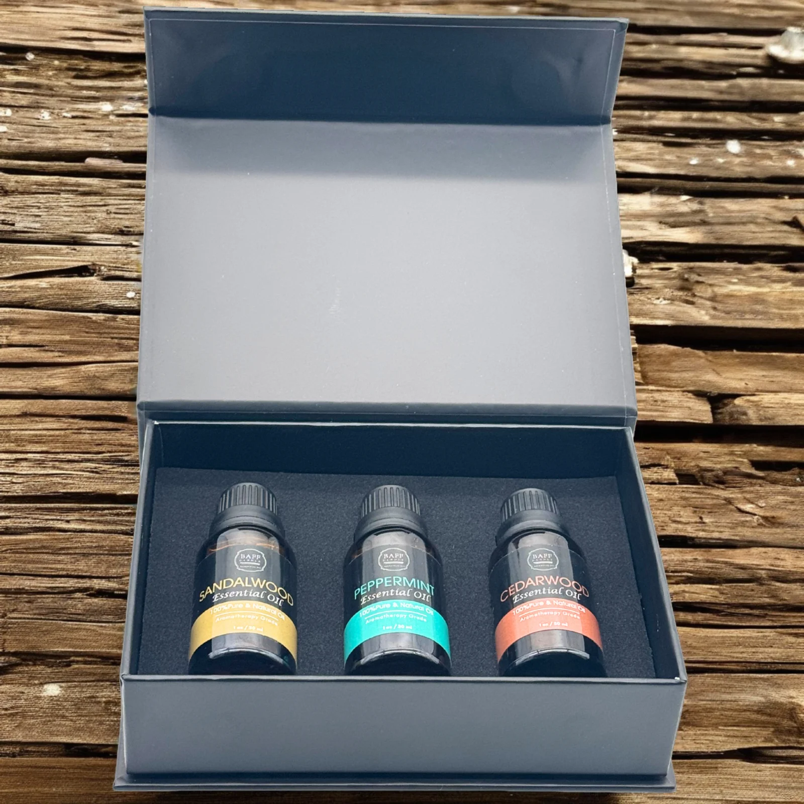 The Baff Candle Essential Oil Collection combines the smooth, meditative aroma of Sandalwood, the cooling freshness of Peppermint, and the warm, grounding scent of Cedarwood to create a balanced and versatile trio. Together, they relax the body, clear the mind, and provide spiritual grounding—ideal for daily wellbeing, focus, and emotional restoration.