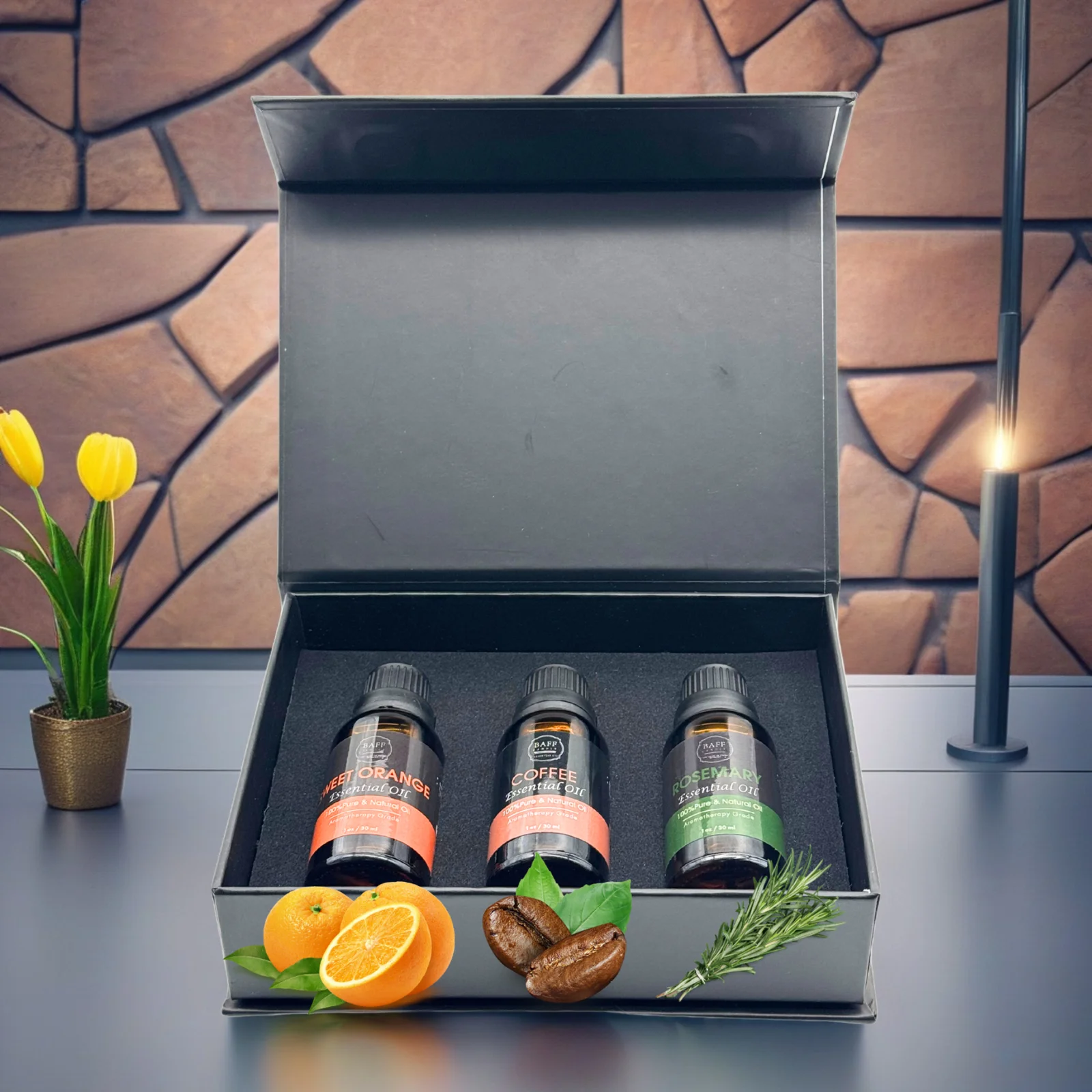 The Baff Candle Essential Oil Collection blends the bright citrus of Sweet Orange, the deep warmth of Coffee, and the crisp herbal freshness of Rosemary to create a vibrant, mood-lifting experience. Together, they awaken the mind, refresh the body, and uplift the spirit—ideal for mornings, work sessions, or any time you need a natural boost.